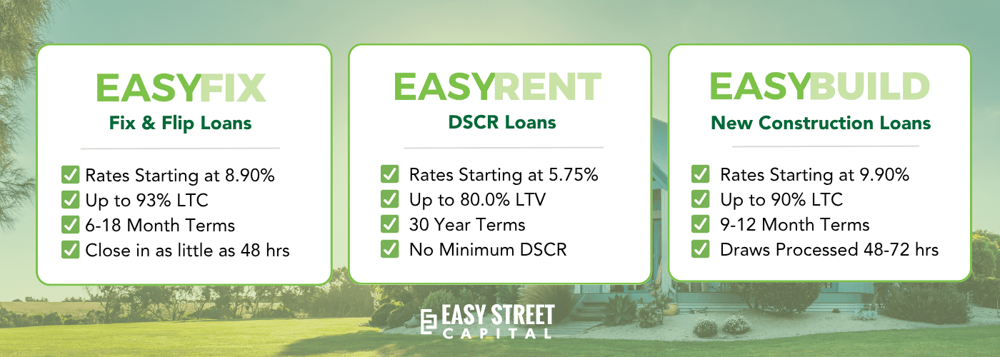 Whether you’re preparing your next flip, evaluating a rental acquisition, or breaking ground on a new construction project, Easy Street Capital is here to help you move with confidence. Explore our loan programs, compare options, or request a term sheet to get started on your next investment opportunity.